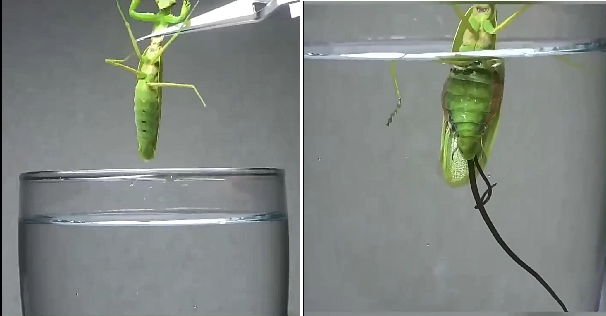 در این ویدیو، فردی بخشی از بدن یک آخوندک را درون لیوان آب فرو میبرد و در ادامه، پدیدهای عجیب رخ میدهد و انگل درون بدن این حشره از آن خارج میشود.