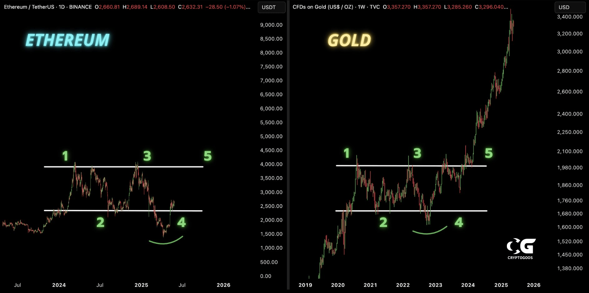 بر اساس تحلیل تکنیکال منتشرشده، نمودار اتریوم شباهت چشمگیری با ساختار تجمیعی چندساله طلا از ۲۰۱۹ تا ۲۰۲۴ دارد؛ الگویی شامل پنج نقطه کلیدی، یعنی دو سقف محلی (نقاط ۱و ۳)، دو اصلاح عمیق (نقاط ۲ و ۴) و یک کف گرد قبل از بریکآوت انفجاری (نقطه ۵) که در نهایت منجر به جهش چشمگیر قیمت طلا در اوایل ۲۰۲۴ شد.