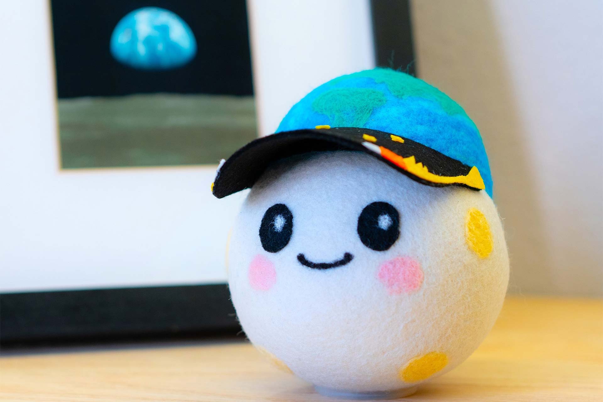 توضیح تصویر مقاله: رایز درمقابل قاب عکس طلوع زمین. کلاه عروسک بهگونهای طراحی شده که انگار سیاره زمین درحال برآمدن از پشت ماه است.